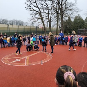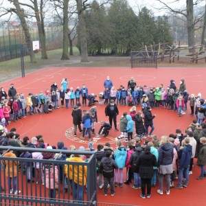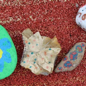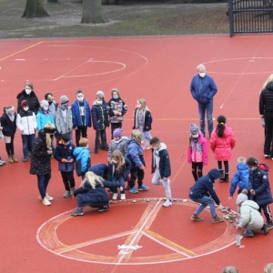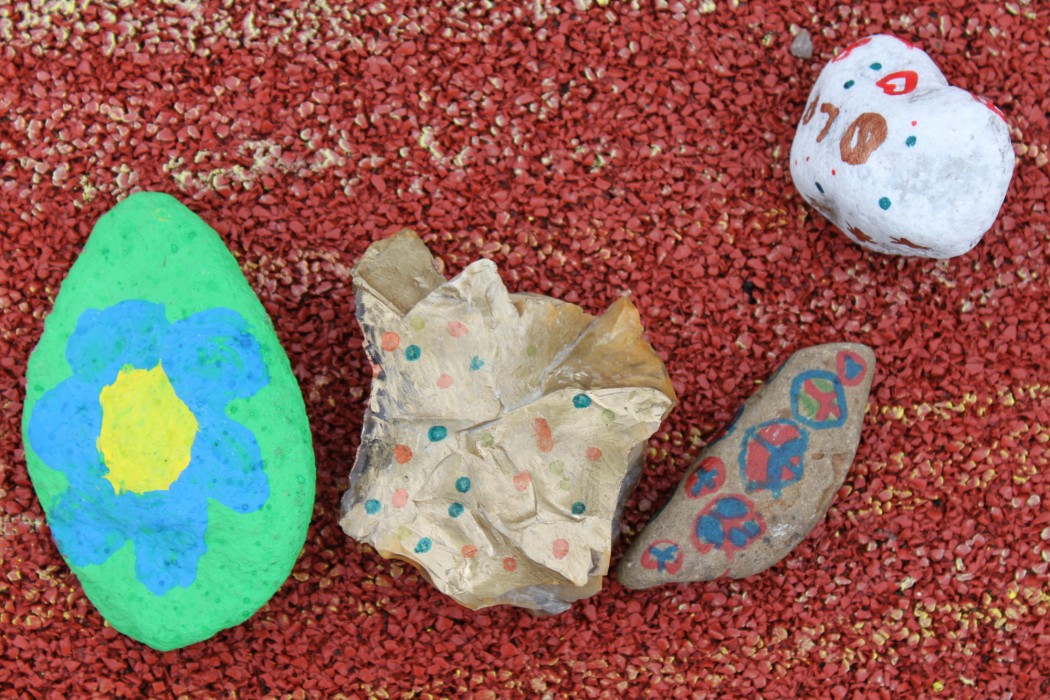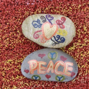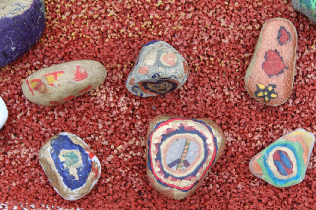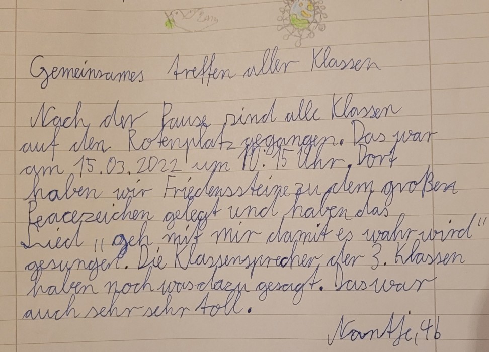 Die Kinder gestalteten im Kunstunterricht "Steine für den Frieden" mit Bildern und Wünschen gegen den Krieg in der Ukraine und für Frieden. Aus den vielen Friedenssteinen entsteht auf dem roten Platz ein großes Peace-Zeichen als Zeichen von Verbundenheit und Solidarität. Die Klassensprecher*innen der 3. Klasse tragen Fürbitten gegen den Krieg in der Ukraine und für Frieden auf der Welt vor. Mit dem gemeinsamen Singen eines Friedensliedes wird die Aktion beendet.