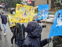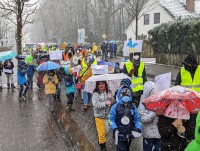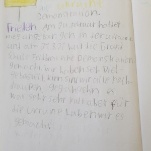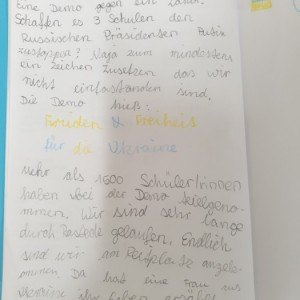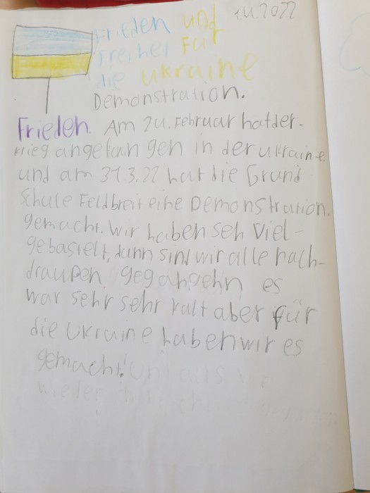Ca. 1500 Schüler*innen und Lehrer*innen der KGS Rastede und der GS Feldbreite demonstrierten am 31.03.2022 gegen den Krieg in der Ukraine und für Frieden auf der Welt. Der Demonstrationszug zog dabei von beiden Schulen durch den Ort bis zum Turnierplatz; viele Schüler*innen hatten Plakate und Banner gebastelt. Auf dem Turnierplatz sendeten die Schülerinnen und Schüler der AG für den Frieden und die Klassensprecher*innen der vierten Klassen der GS Feldbreite mit ihren Wortbeiträgen klare und bewegende Botschaften für den Frieden.