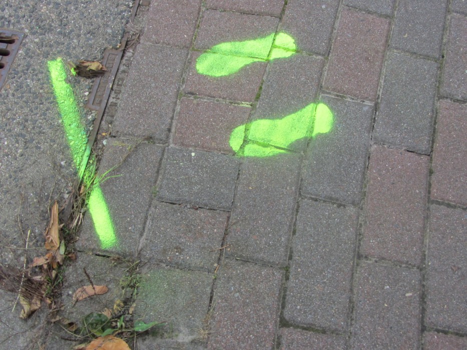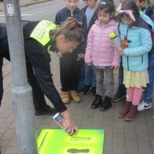 Kurz nach den Herbstferien machten sich die Erstklässler mit Frau Walter, Verkehrssicherheitsberaterin bei der Polizei, auf den Weg, um Gefahrenpunkte im Umfeld der Schule aufzuspüren. An diesen Stellen wurden "Gelbe Füße" als gut sichtbares Zeichen aufgesprüht. Diese warnen die Kinder: "Vorsicht! Hier musst du besonders aufpassen!" Die "Gelben Füße" machen auf Gefahrenpunkte aufmerksam und geben den Kindern an unübersichtlichen Stellen Orientierung.