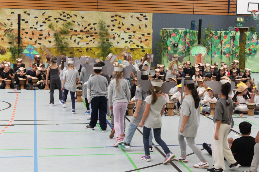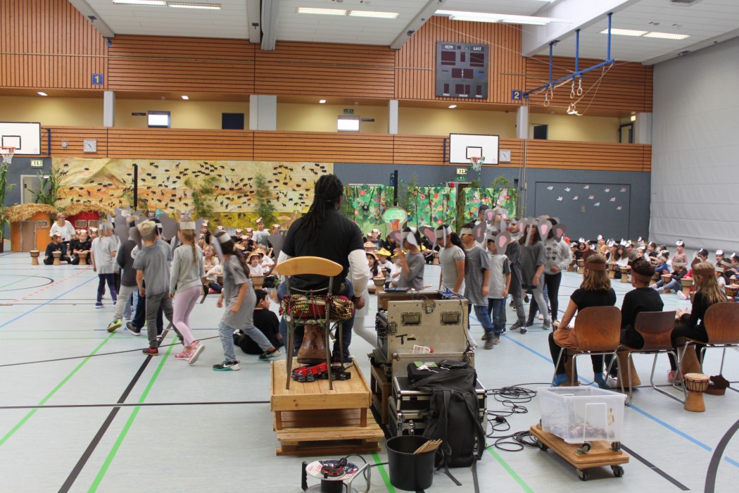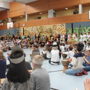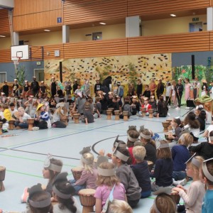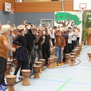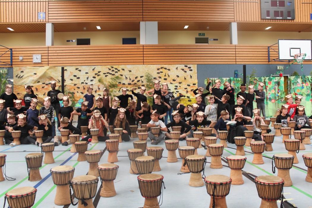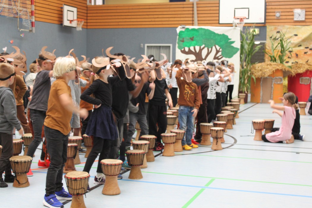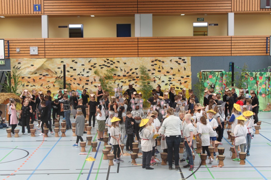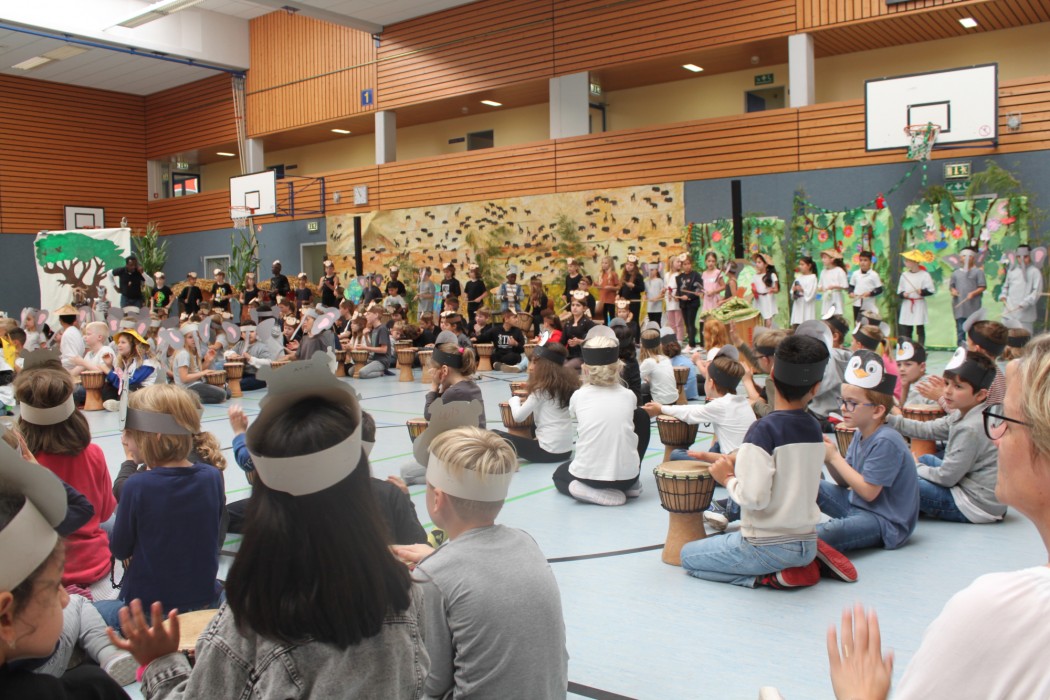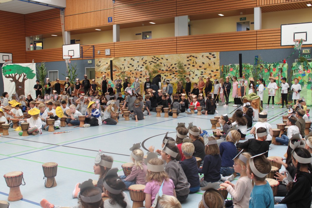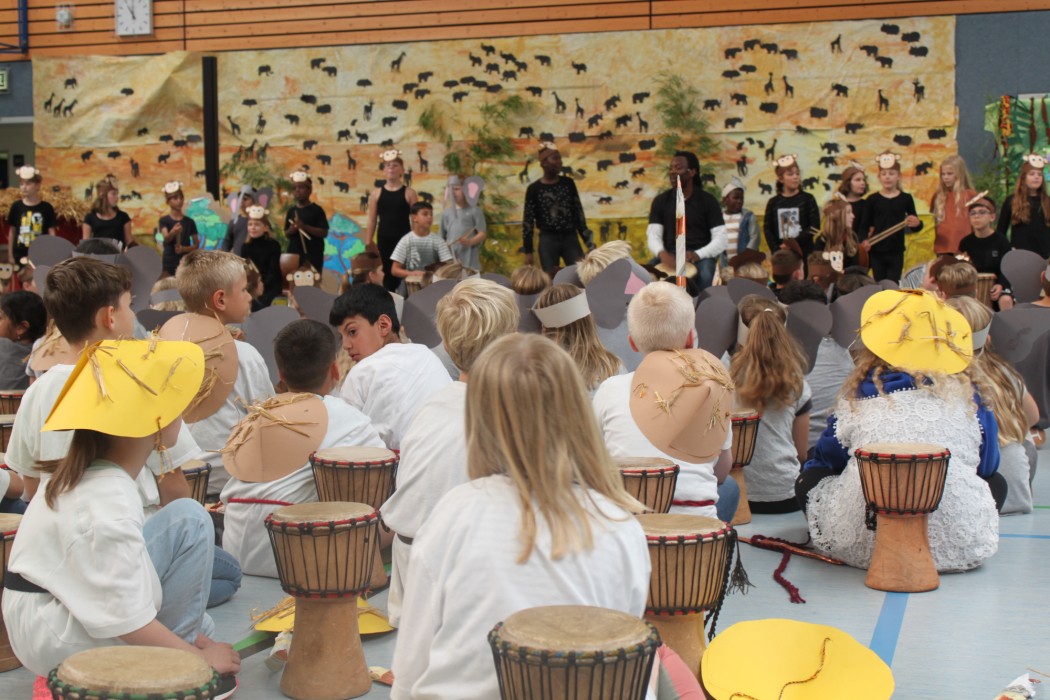 Der Höhepunkt war schließlich das große Finale am Freitag in der Mehrzweckhalle. Hier präsentierten die Kinder stolz, was sie in der Projektwoche gelernt und einstudiert hatten. Die verschiedenen Jahrgänge stellten dabei verschiedene Trommelgruppen wie Hippos und Pinguine (Kl. 1), Zebras und Gnus (Kl. 2), Elefanten und Reispflanzer (Kl. 3) sowie Affen (Kl. 4) dar. Die Kinder Juju und Sibonga und eine freche Affengruppe waren die Hauptpersonen des Trommelmärchens, das von mehreren Erzählerinnen und Erzählern vorgelesen wurde.