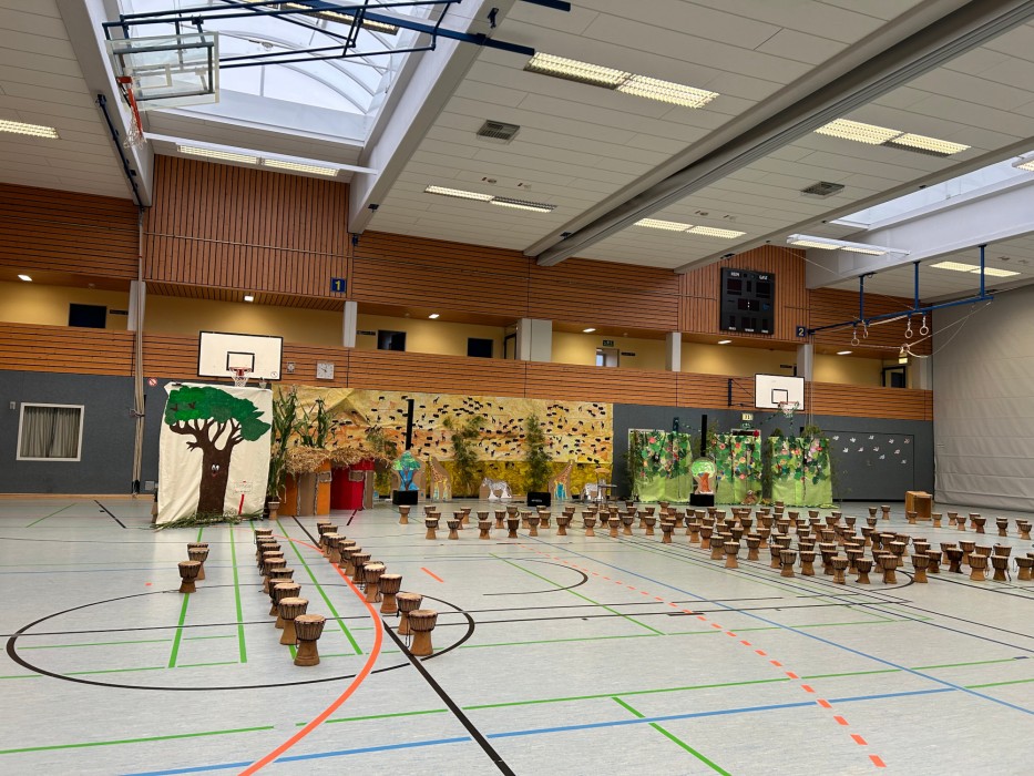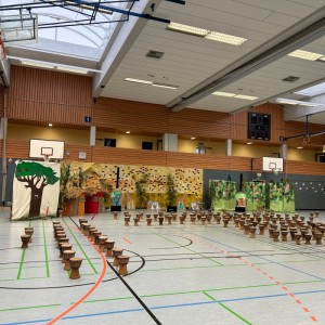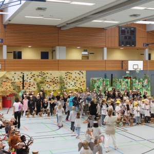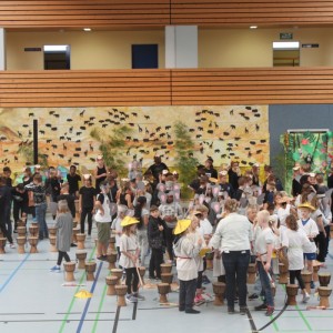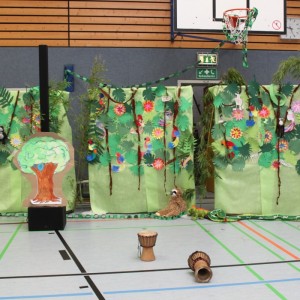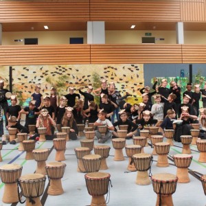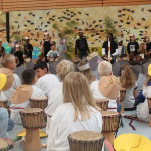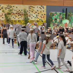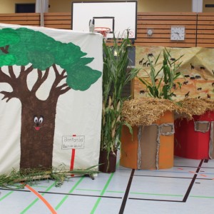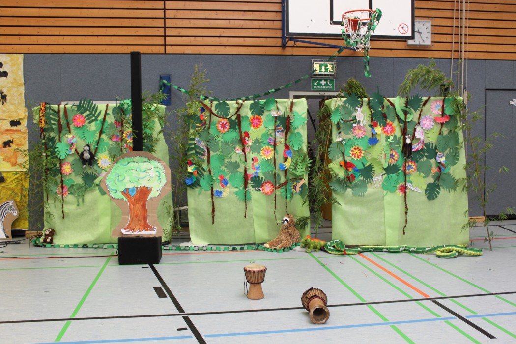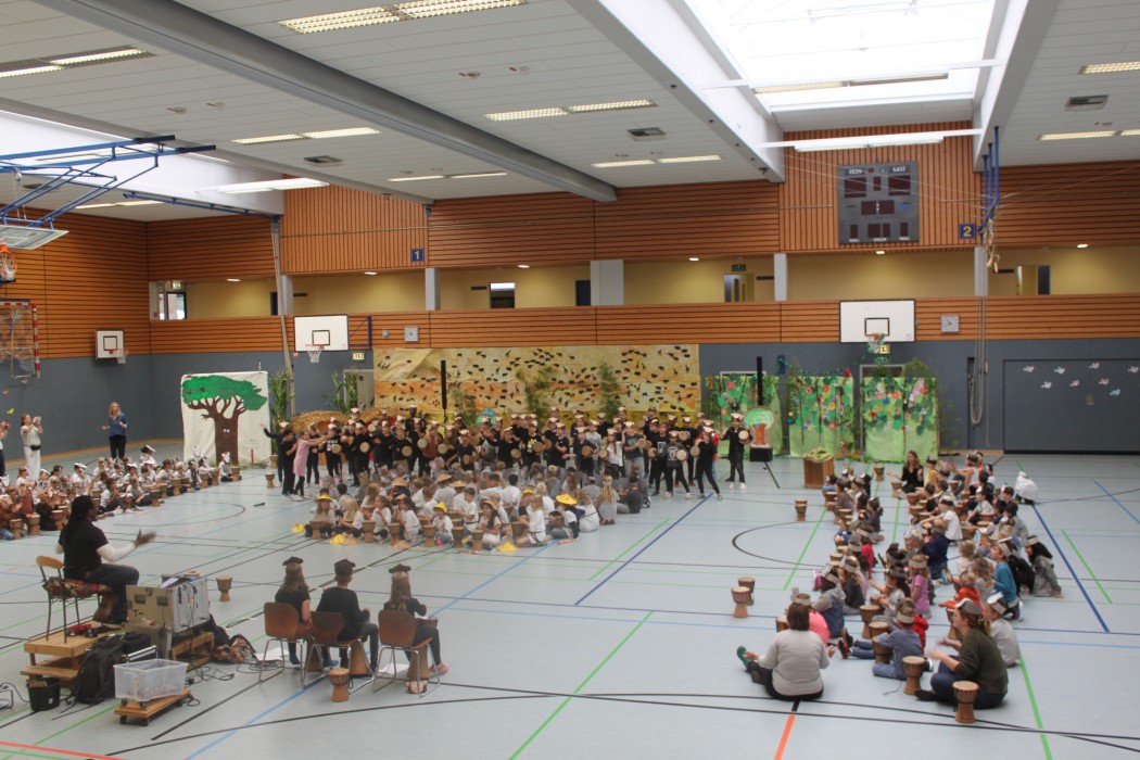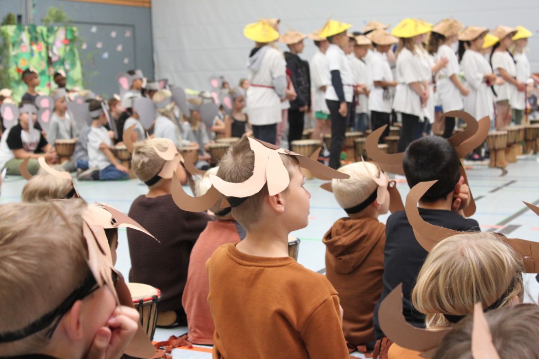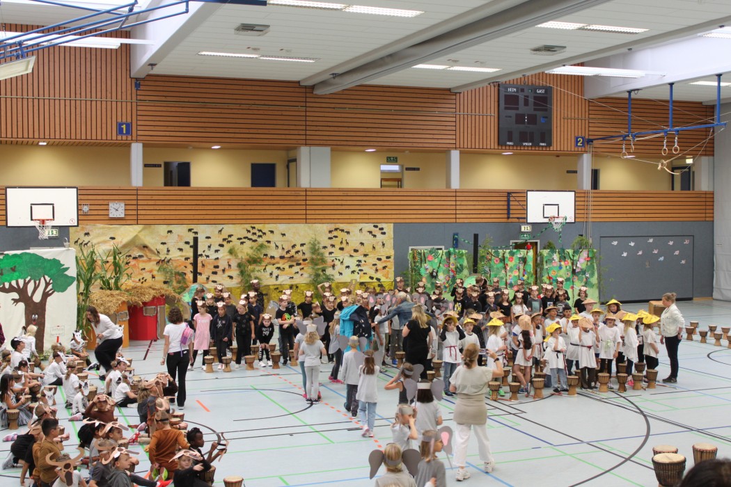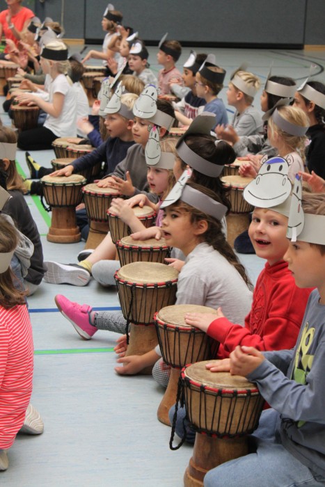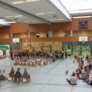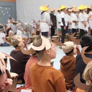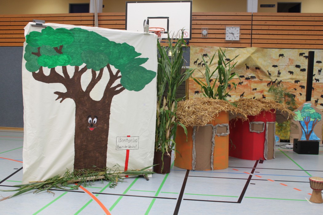 Der Höhepunkt war schließlich das große Finale am Freitag in der Mehrzweckhalle. Hier präsentierten die Kinder stolz, was sie in der Projektwoche gelernt und einstudiert hatten. Die verschiedenen Jahrgänge stellten dabei verschiedene Trommelgruppen wie Hippos und Pinguine (Kl. 1), Zebras und Gnus (Kl. 2), Elefanten und Reispflanzer (Kl. 3) sowie Affen (Kl. 4) dar. Die Kinder Juju und Sibonga und eine freche Affengruppe waren die Hauptpersonen des Trommelmärchens, das von mehreren Erzählerinnen und Erzählern vorgelesen wurde.